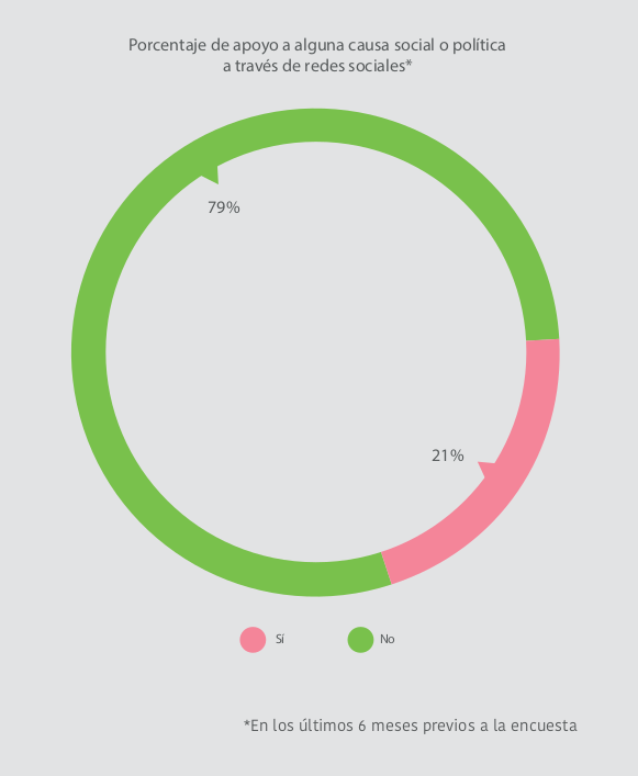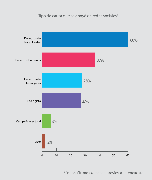 Los resultados también señalan que el 21% de las y los internautas sí apoyó a alguna causa social o política a través de redes sociales, en los 6 meses previos a la realización de la encuesta. La causa más apoyada es la referente a la de los derechos de los animales.