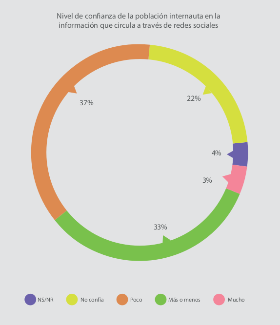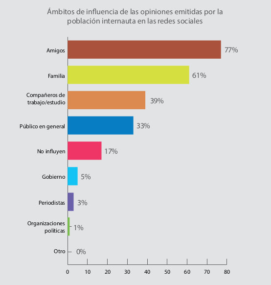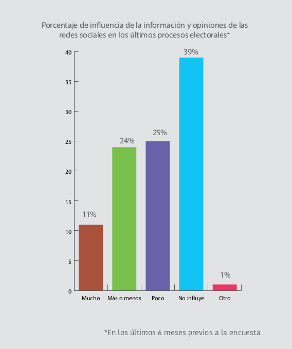 Entre otra información, especifica que los amigos y la familia son los círculos más influyentes en redes sociales, no obstante el 22% no confía en la información que circula en estas plataformas y el 37% confía poco. Asimismo el 73% señala que las redes sociales no influyen en algún cambio de opinión sobre algún tema de interés nacional y el 39% que no influyeron en los últimos procesos electorales.