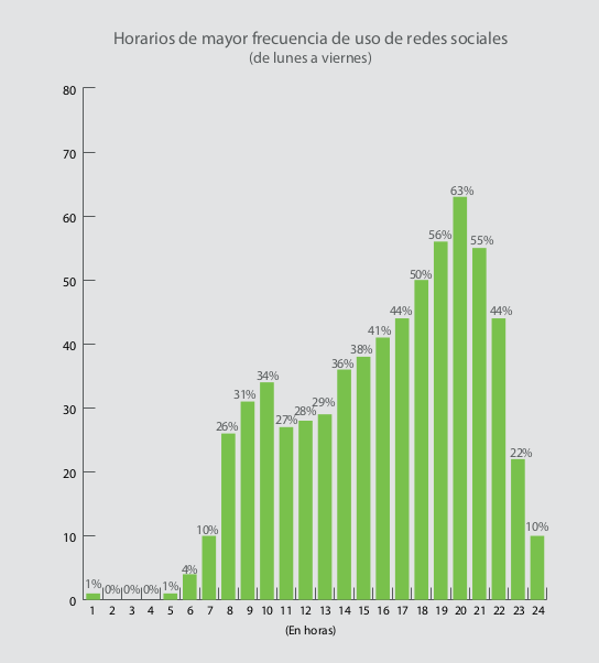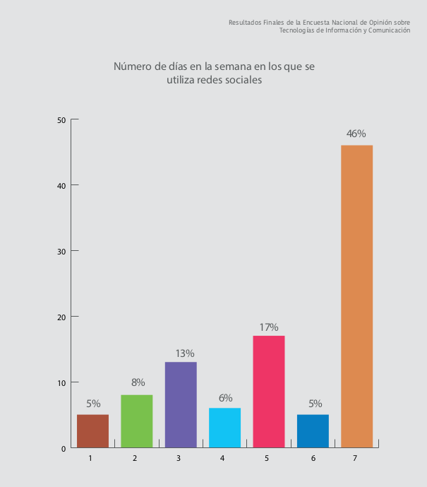 (28 de diciembre, 2017).- Según la Encuesta Nacional de Opinión sobre Tecnologías de Información y Comunicación, el 46% de las y los internautas utilizan redes sociales los 7 días de la semana y se conectan mayormente en noche, de 19:00 a 21:00 hrs. Asimismo, la actividad que más realizan en estas plataformas es conectarse con amigos y familiares y ver videos y fotografías.